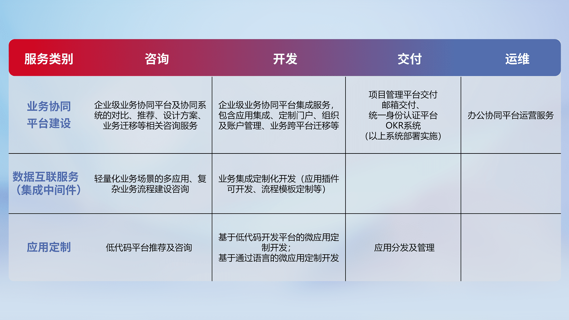 针对钉钉、、、企微、、IDaas等平台级产品提供产品的规划、、、方案、、、、交付、、、定制化开发等服务,,实现如统一协同办公、、、、智能客户服务、、、、混合会议管理、、、、智能数据查询、、、等业务场景,,,实现数字化转型。。。。